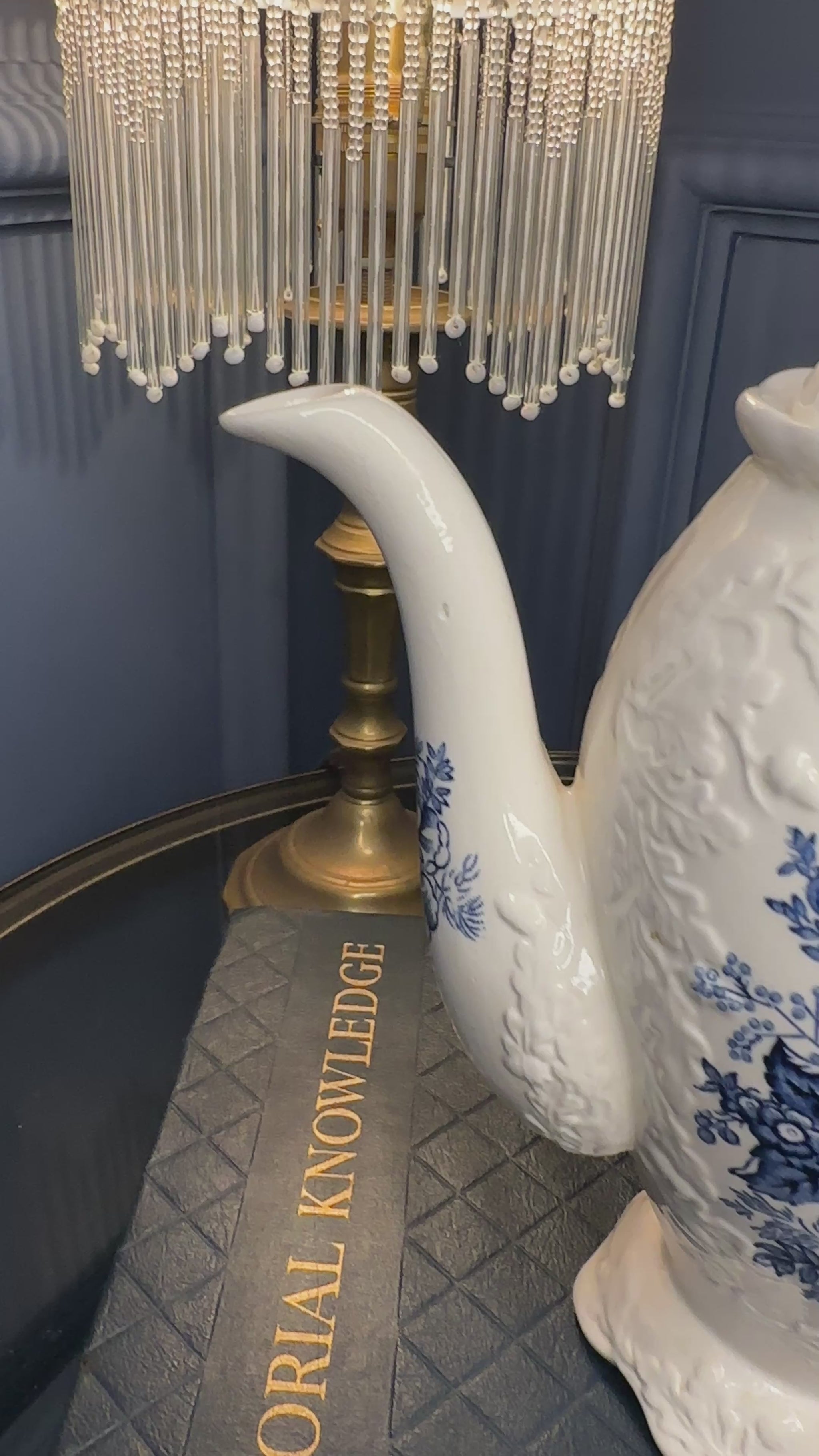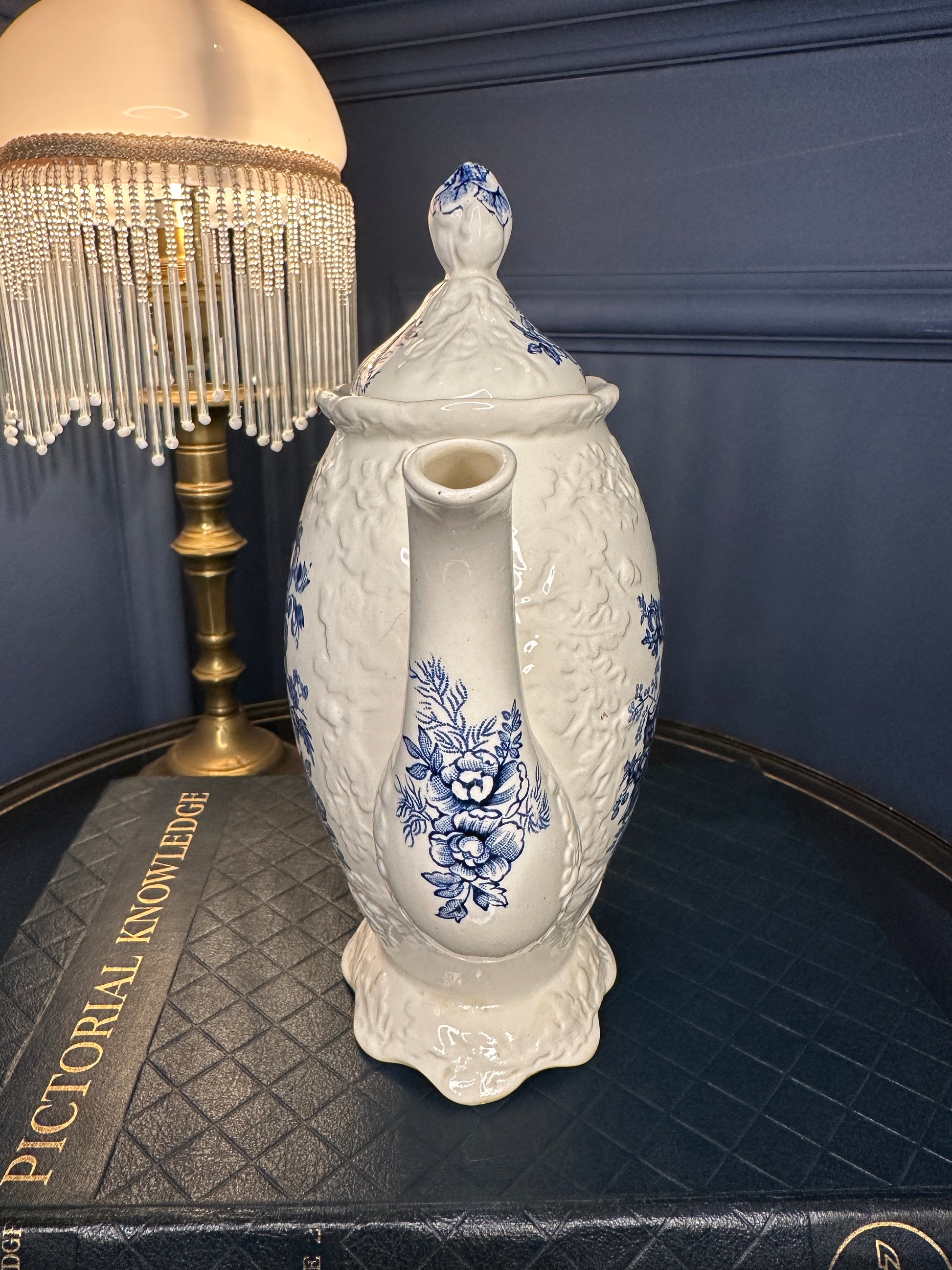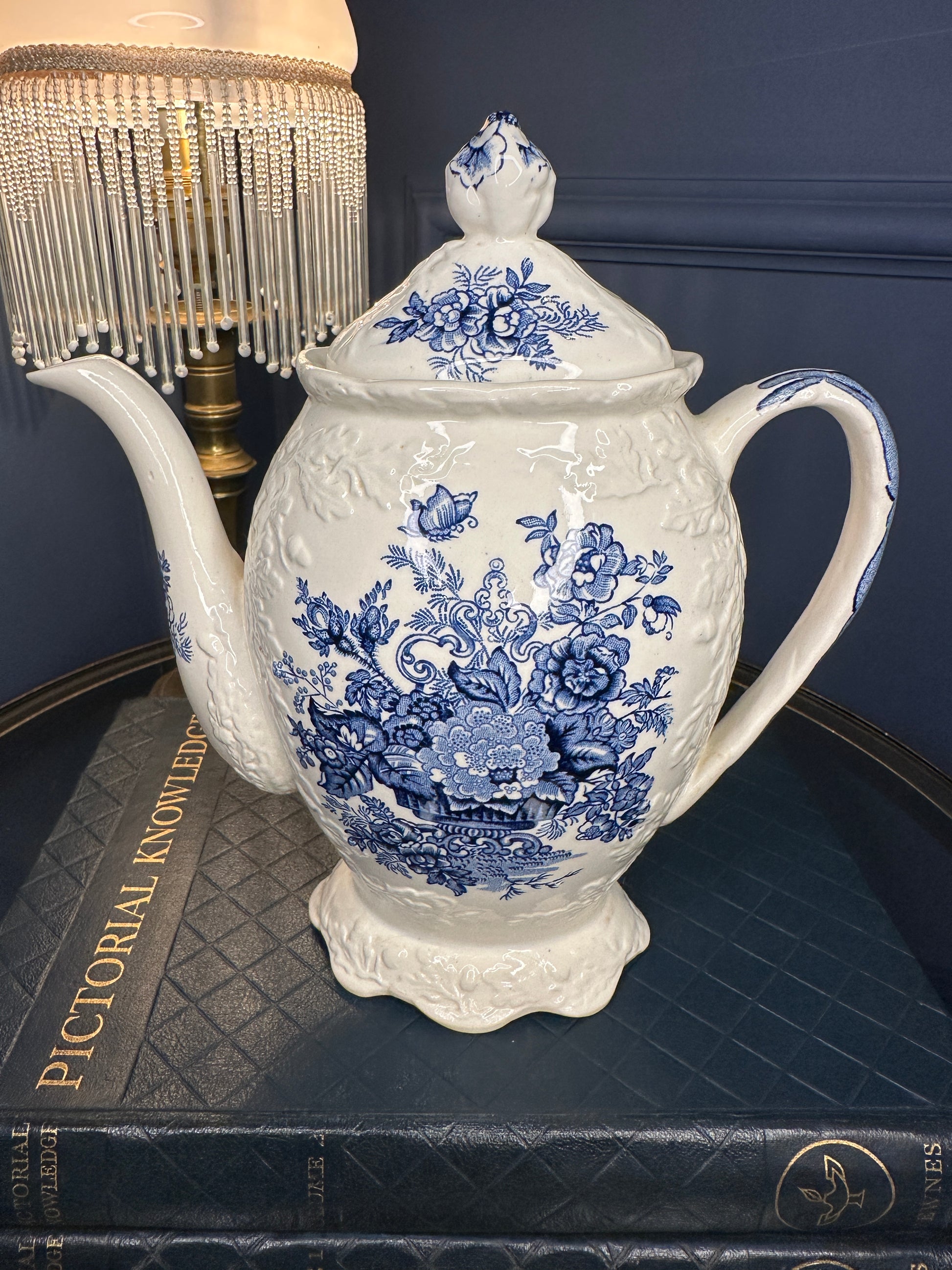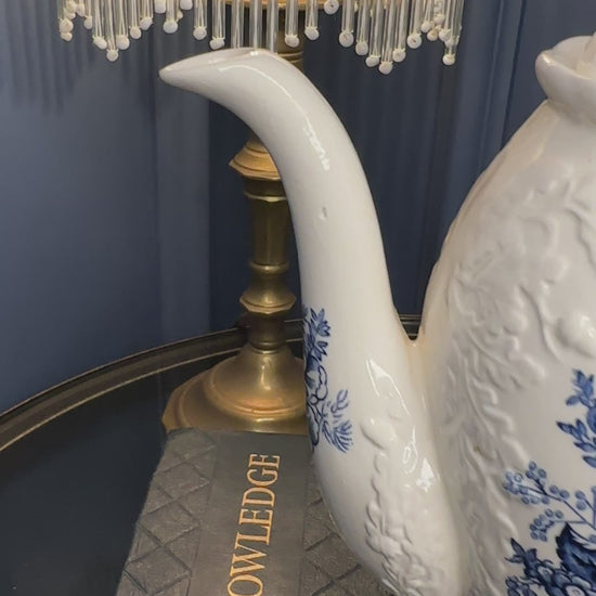 This beautiful ironstone teapot features detailed cobalt floral motifs, a sculpted footed base, curved spout, and decorative finial lid. The base is clearly stamped: