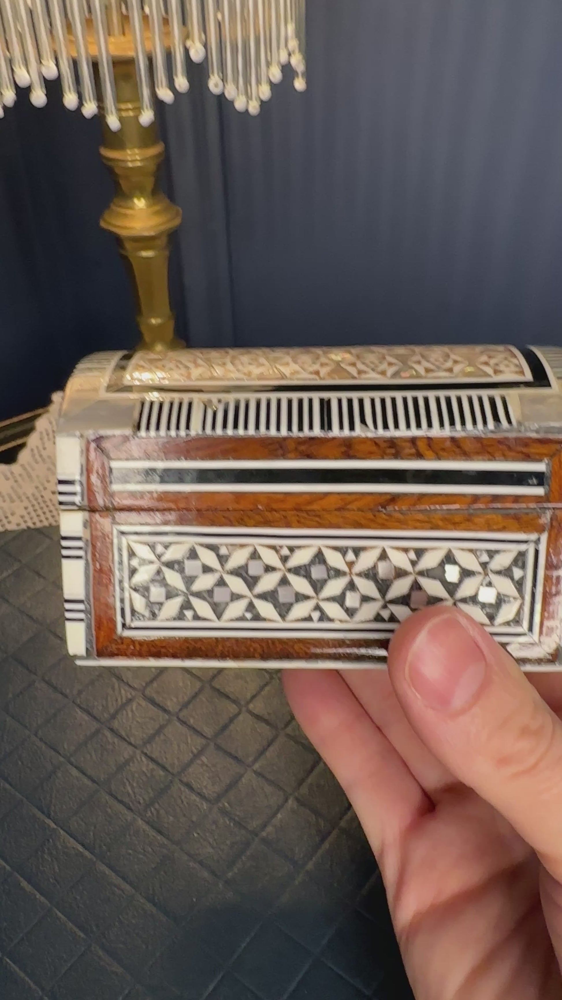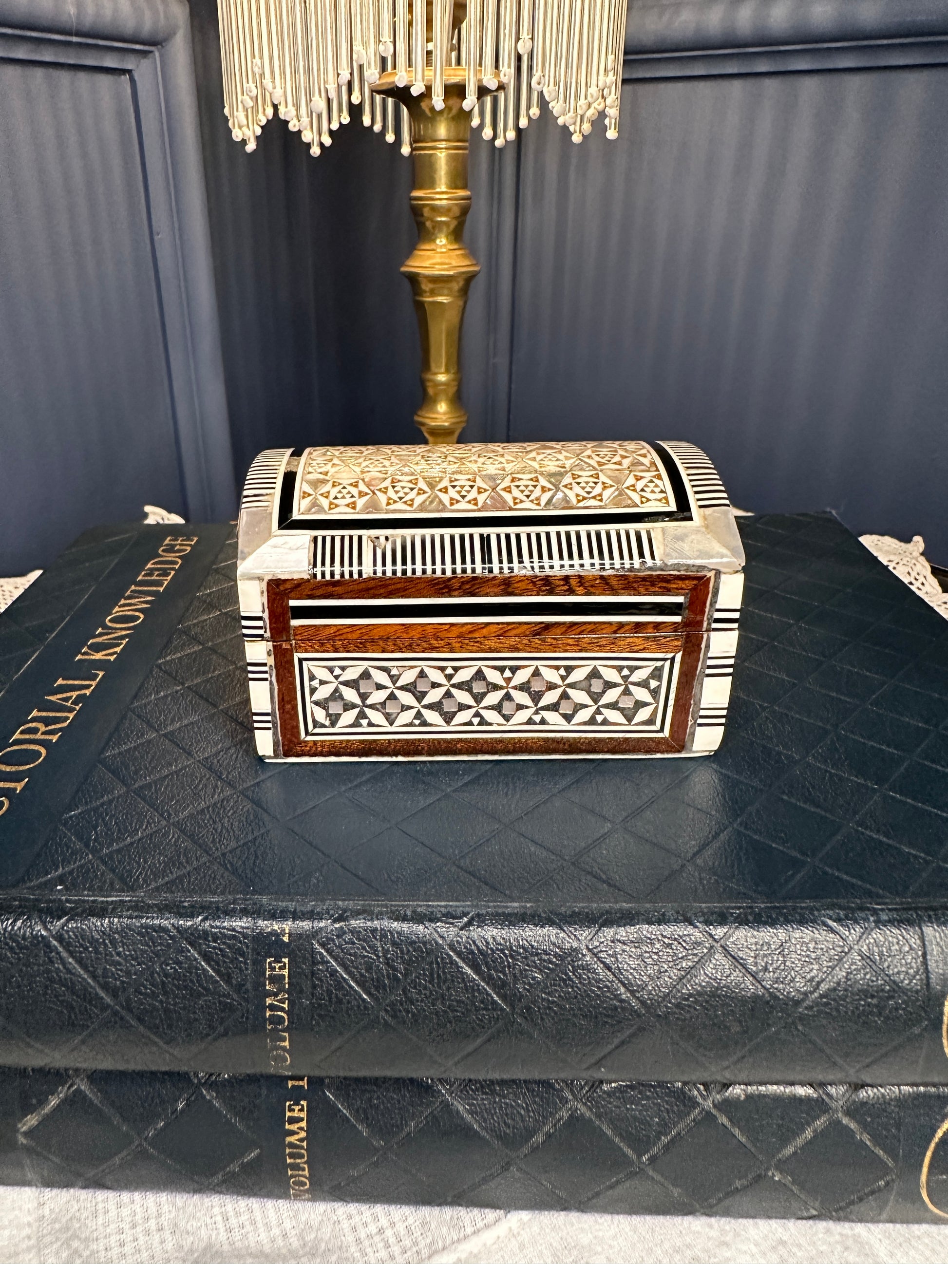 Handmade inlaid wooden jewelry box featuring intricate bone and mother-of-pearl geometric detailing with a beautifully crafted domed lid. The interior is fully lined with soft red velvet, making it ideal for storing rings, earrings, trinkets, or small keepsakes.