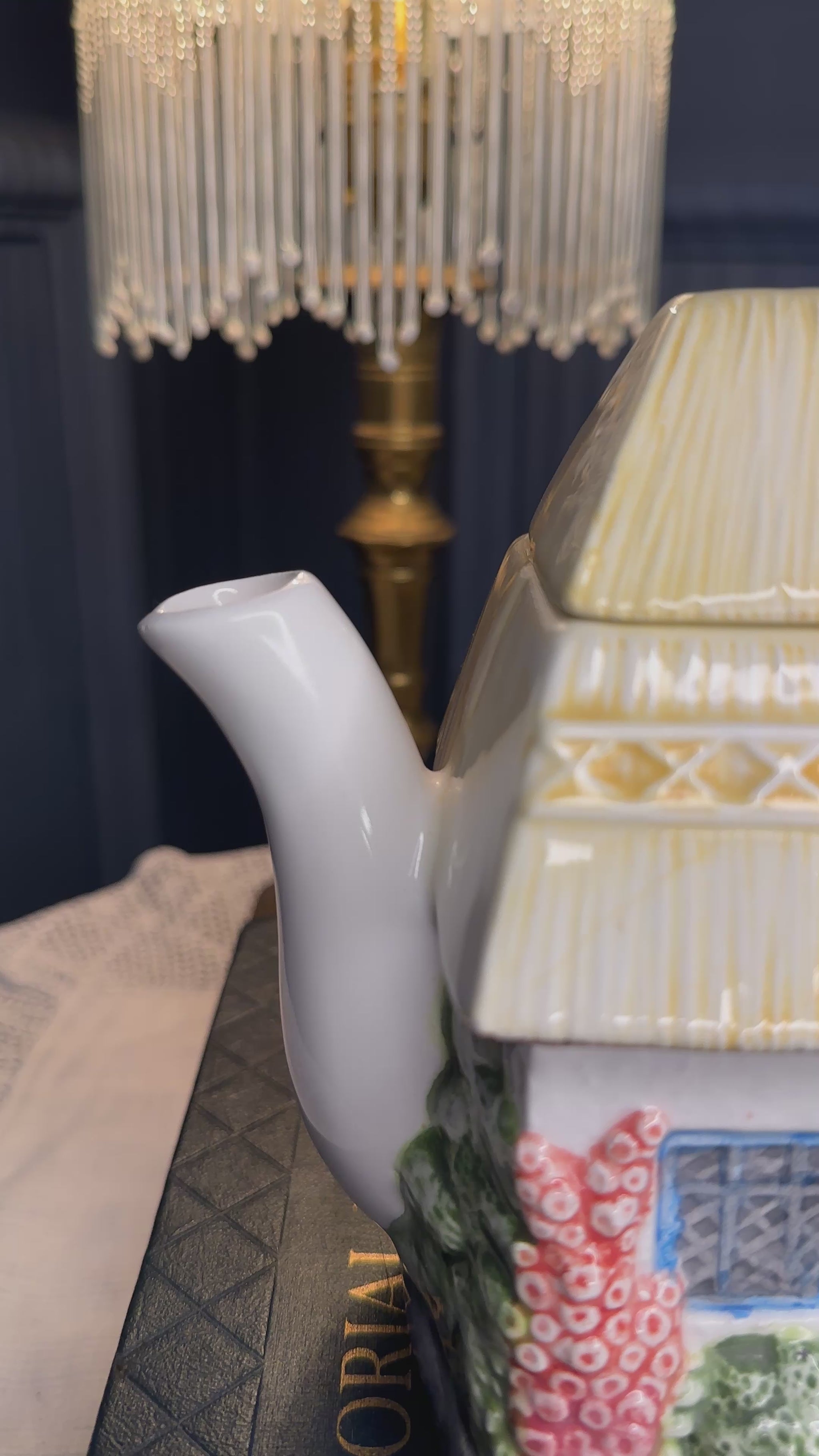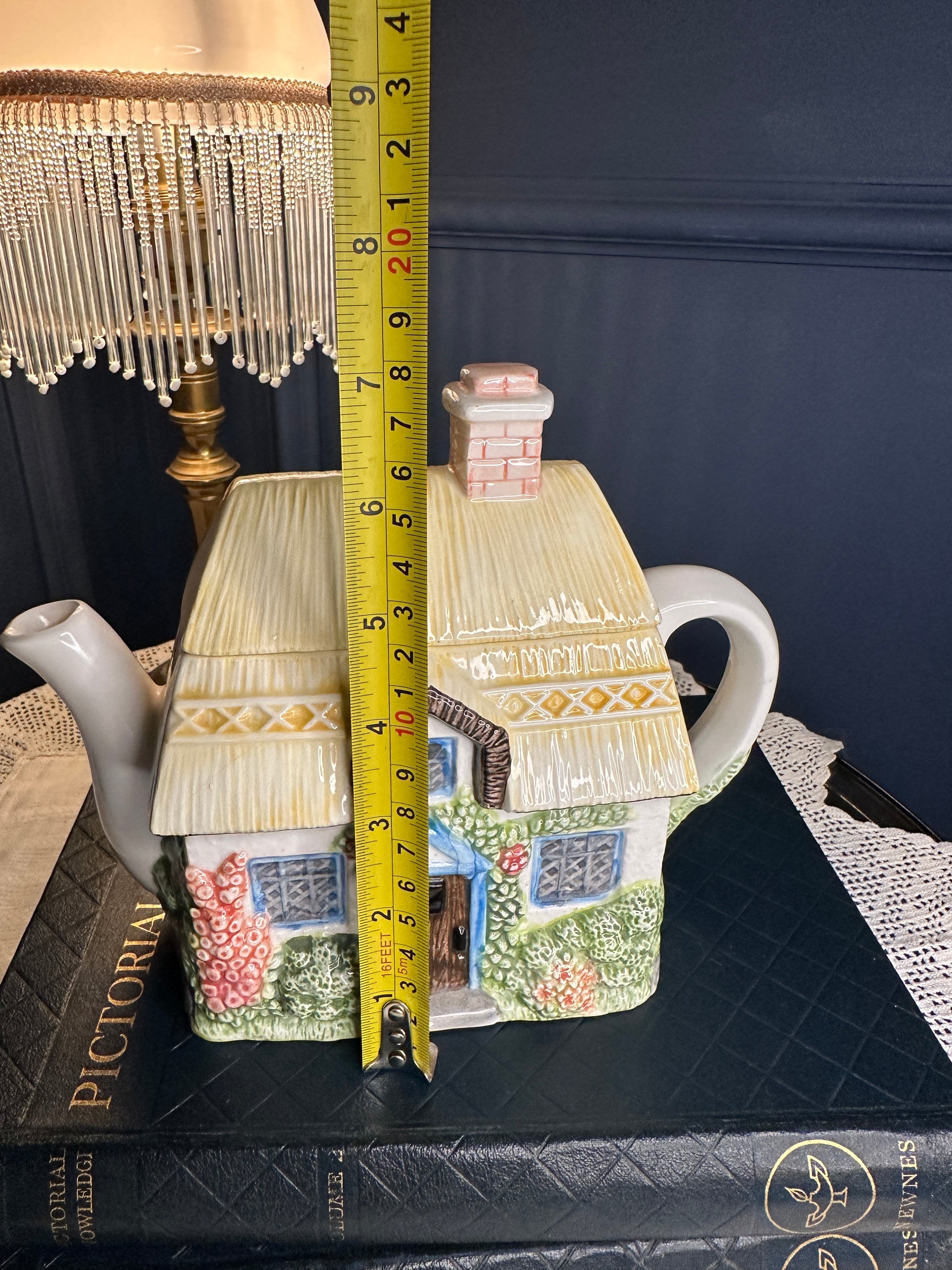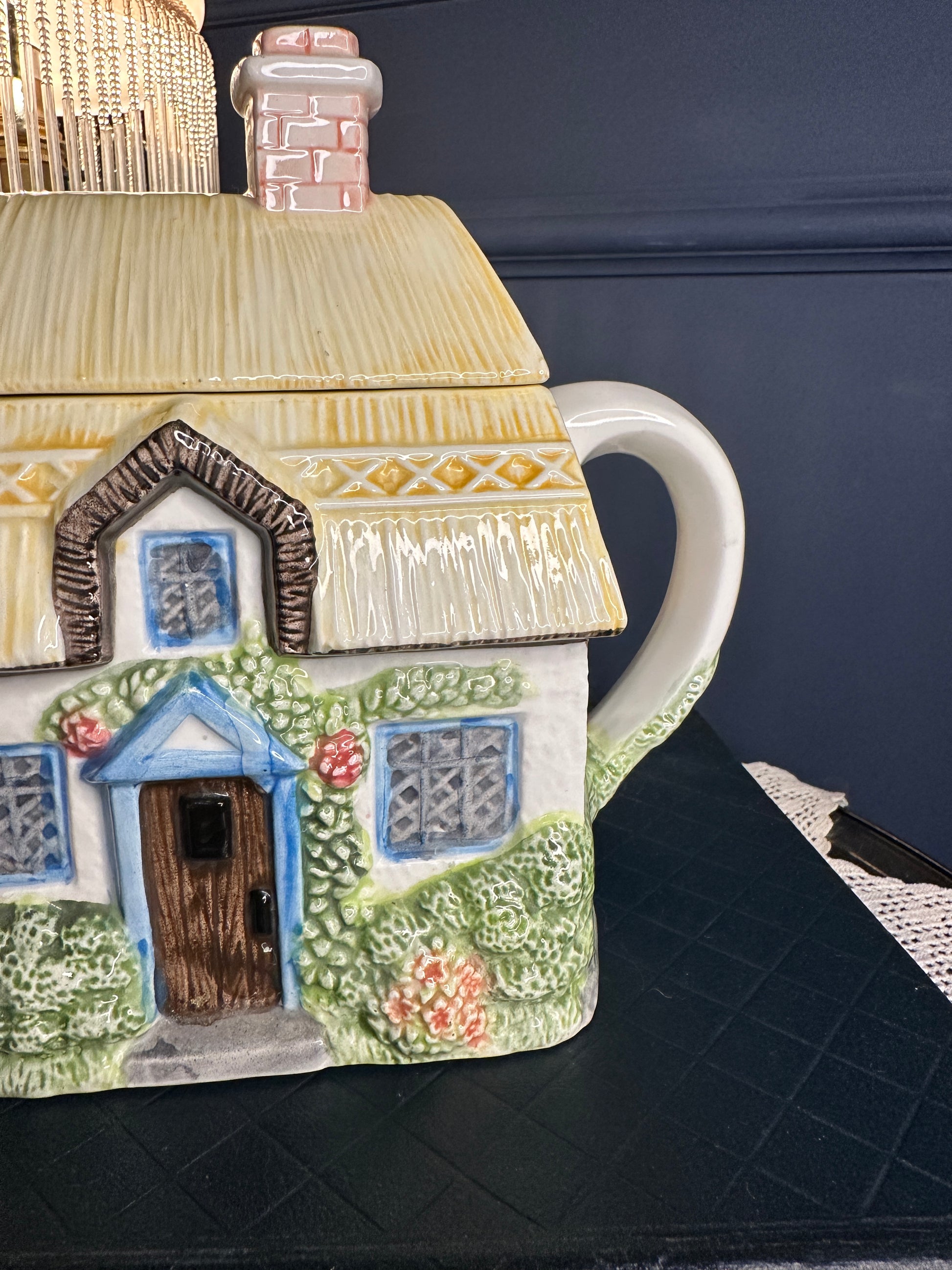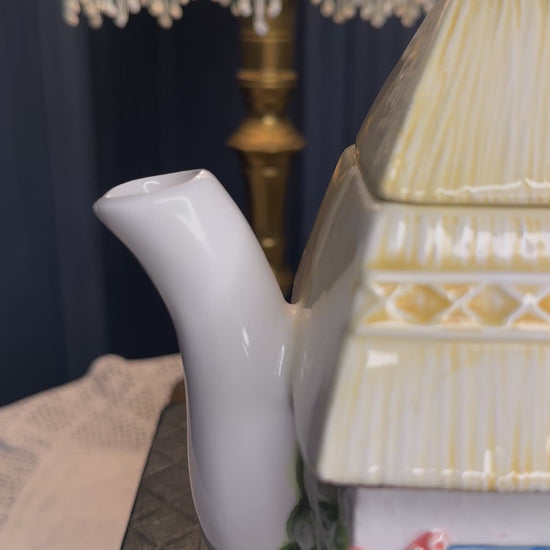 Charming “Summer Cottage” collectible teapot from The Village Teapot Collectables by Annie Rowe. Hand-painted fine ceramic with delightful cottage-garden details and thatched-roof design. Pre-owned, overall good vintage condition with small paint chip and minor interior mark — see photos for details.