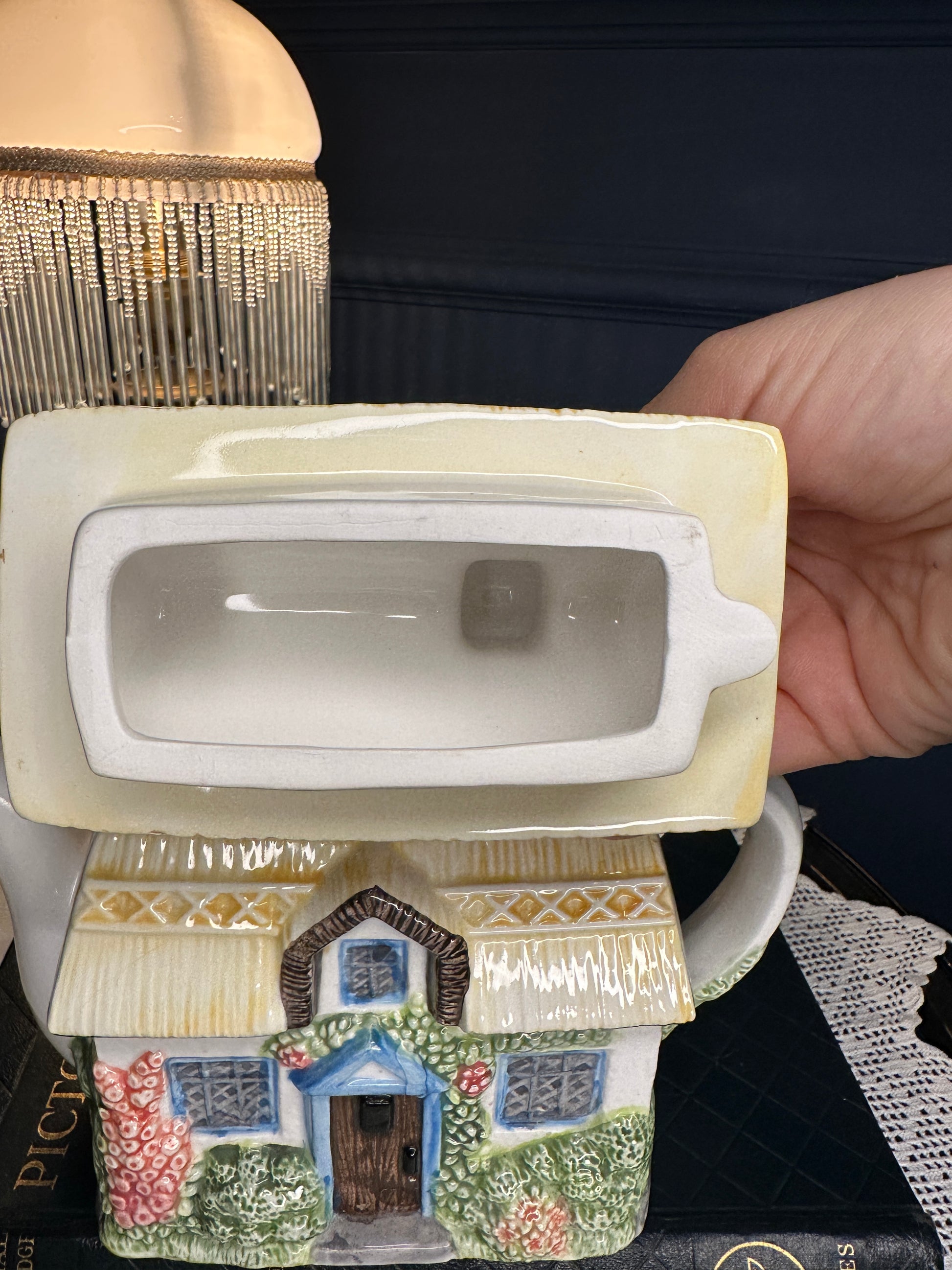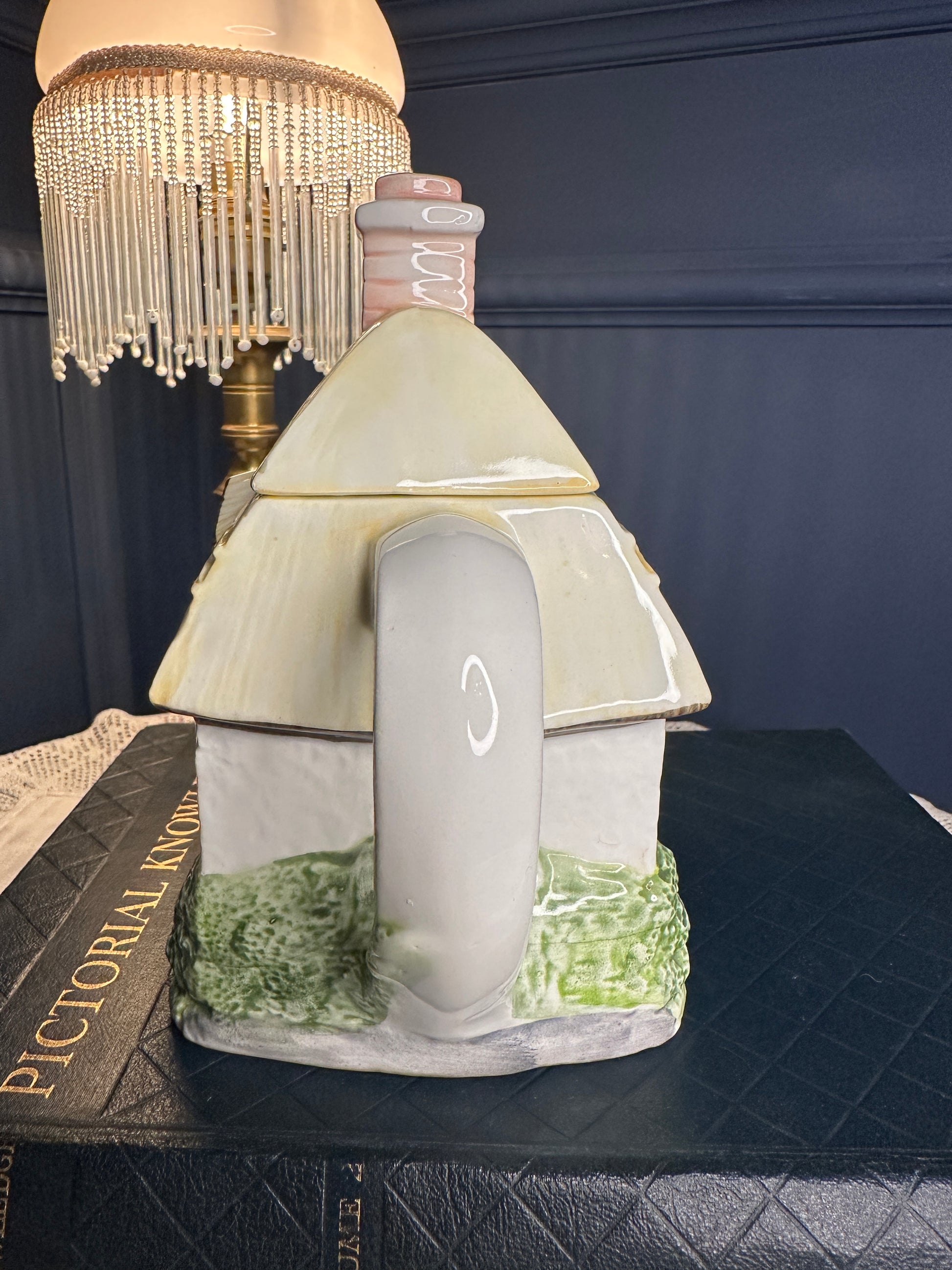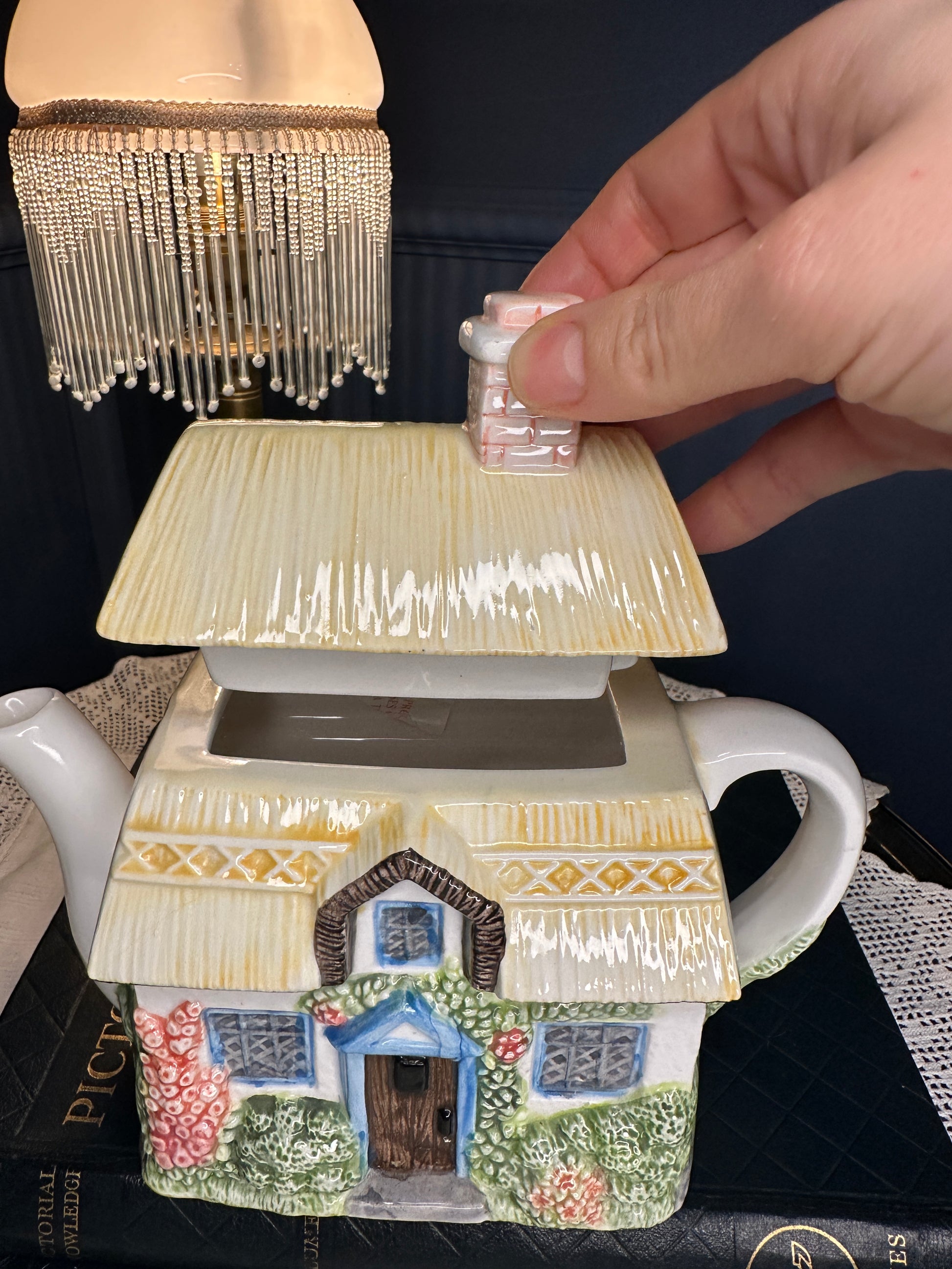Charming “Summer Cottage” collectible teapot from The Village Teapot Collectables by Annie Rowe. Hand-painted fine ceramic with delightful cottage-garden details and thatched-roof design. Pre-owned, overall good vintage condition with small paint chip and minor interior mark — see photos for details.