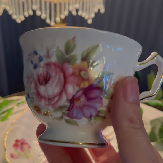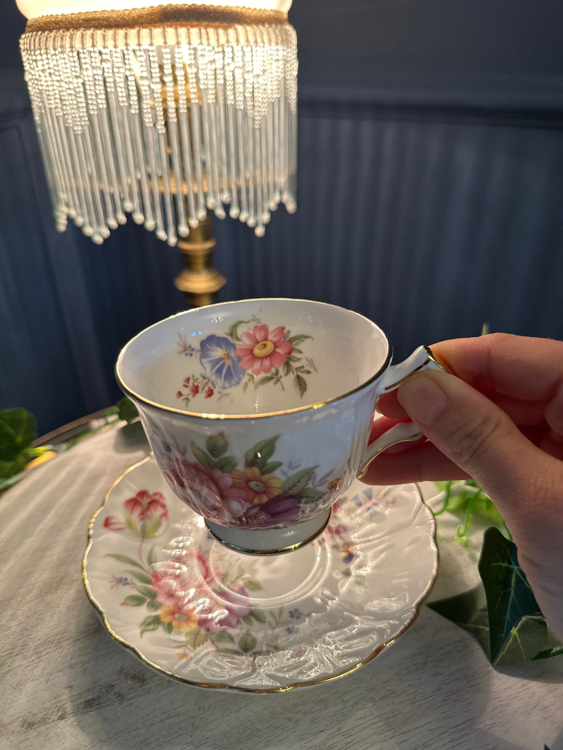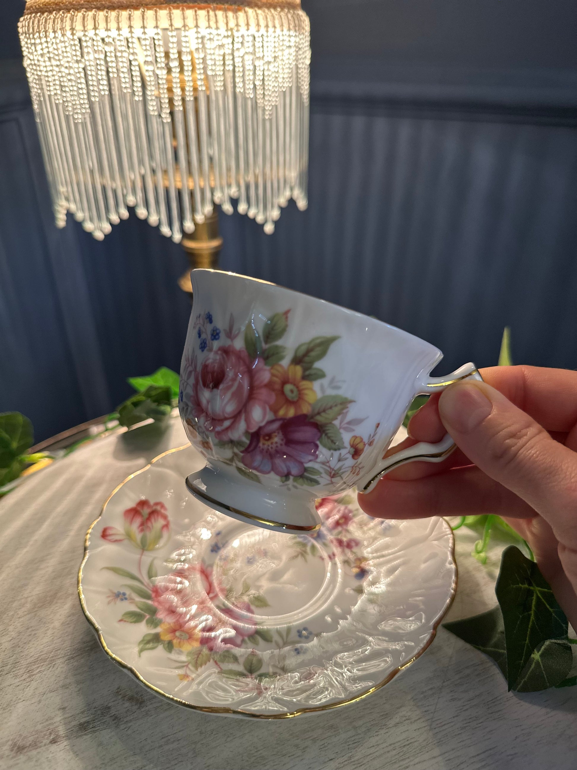 Vintage Aynsley Fine Bone China teacup and matching saucer, made in England. Decorated with soft multicolour floral designs and finished with gold gilt edging. The saucer features a gently scalloped, embossed rim. Both pieces display the Aynsley Fine Bone China – Made in England backstamp.