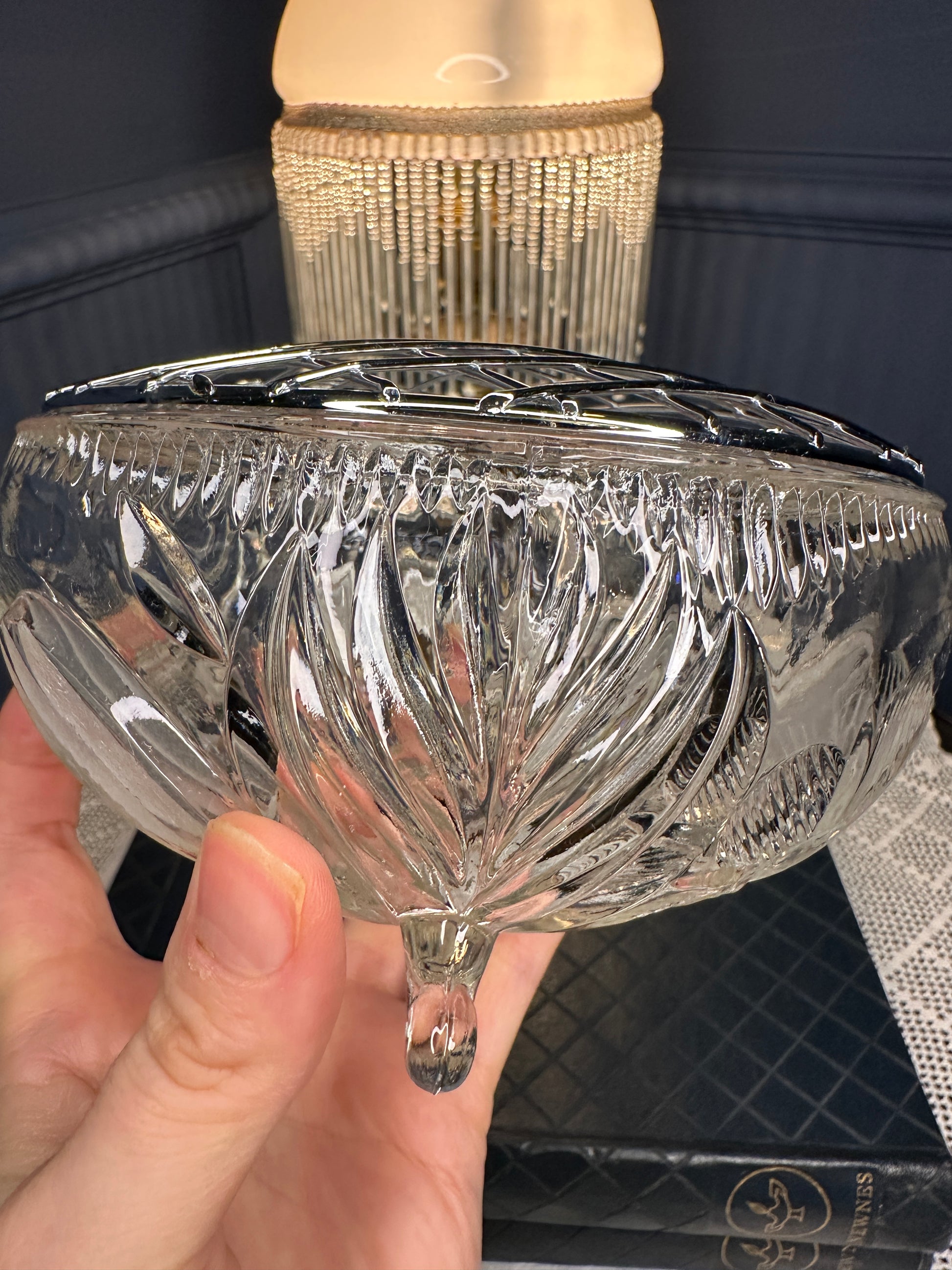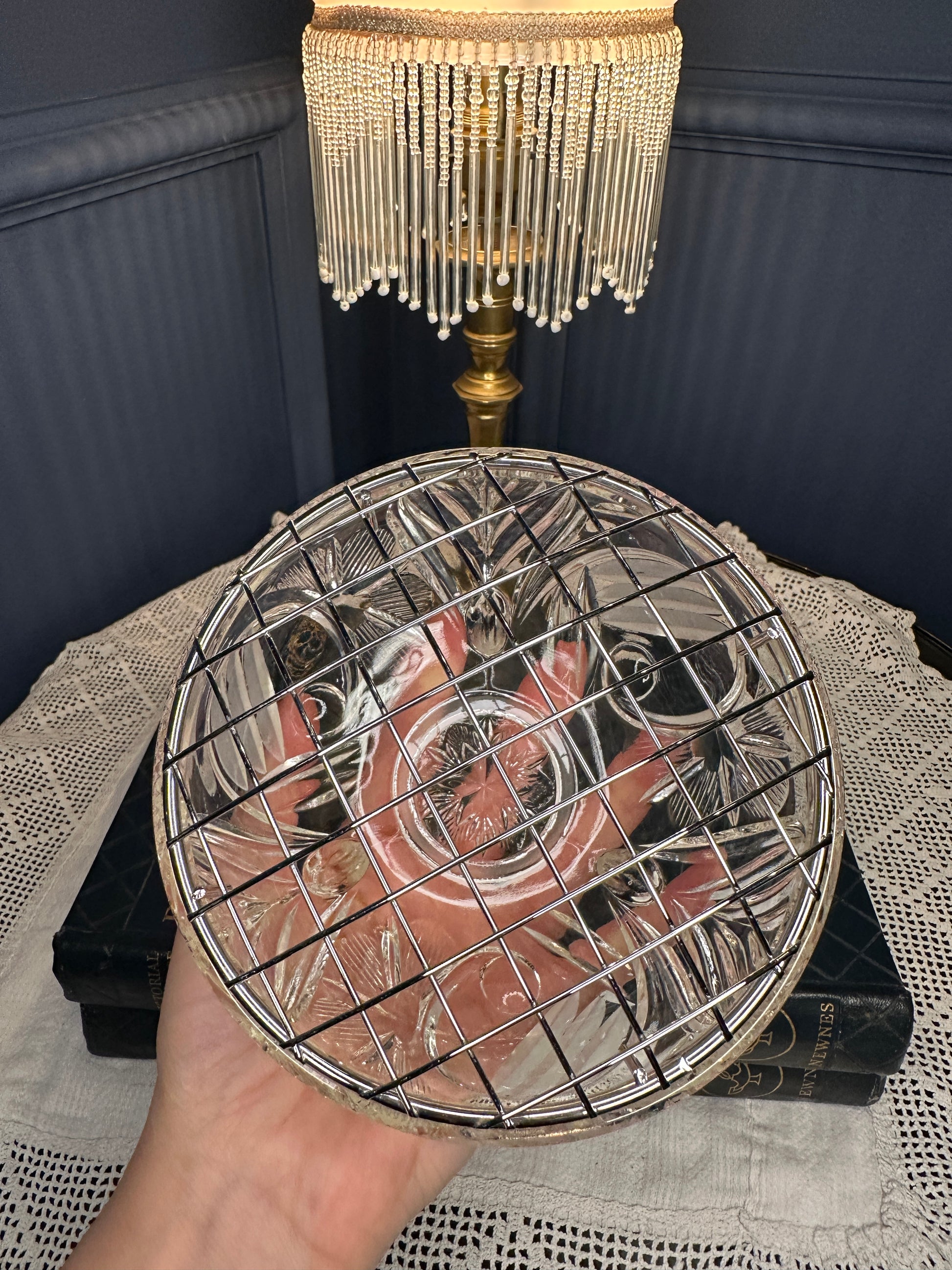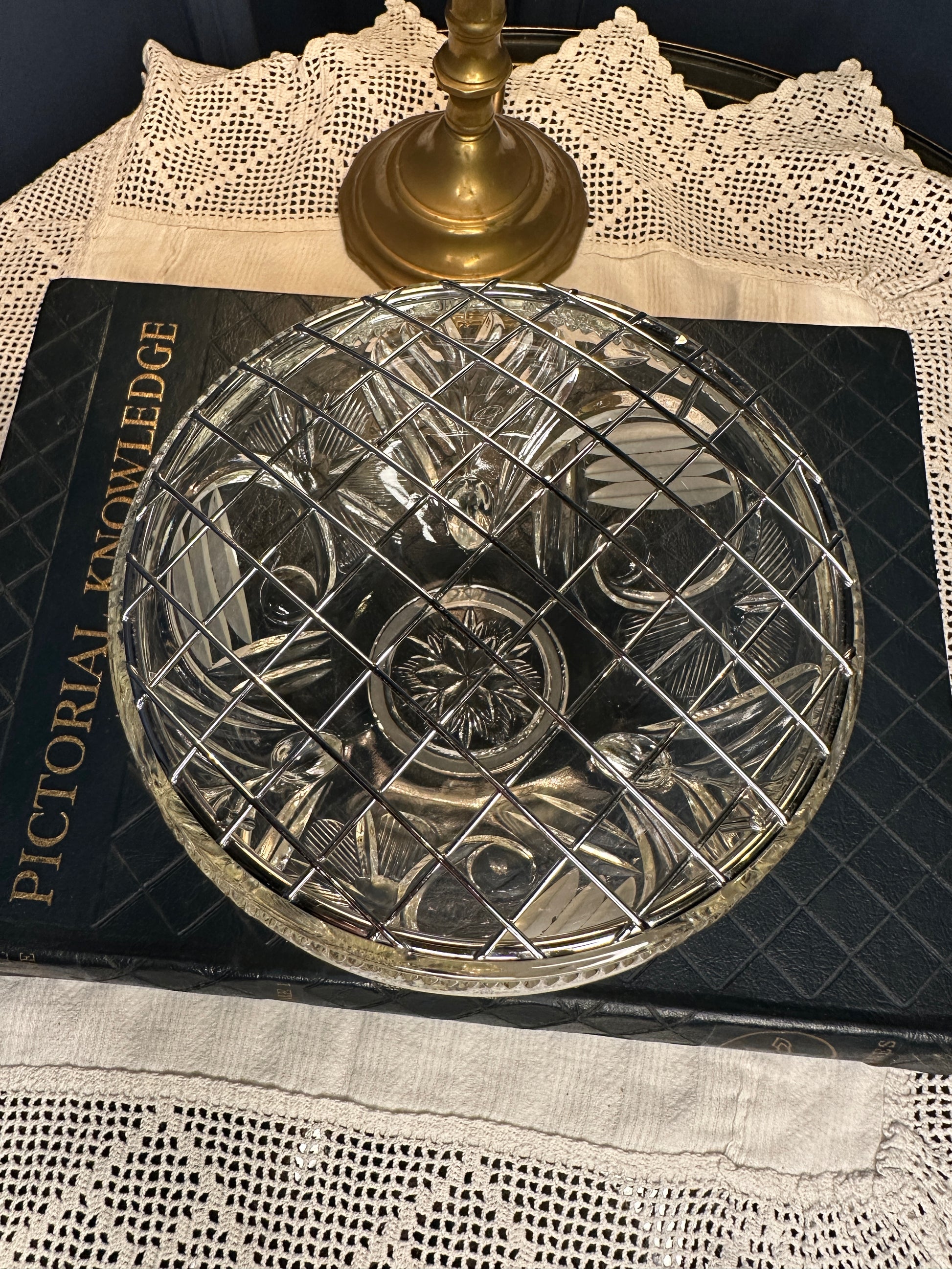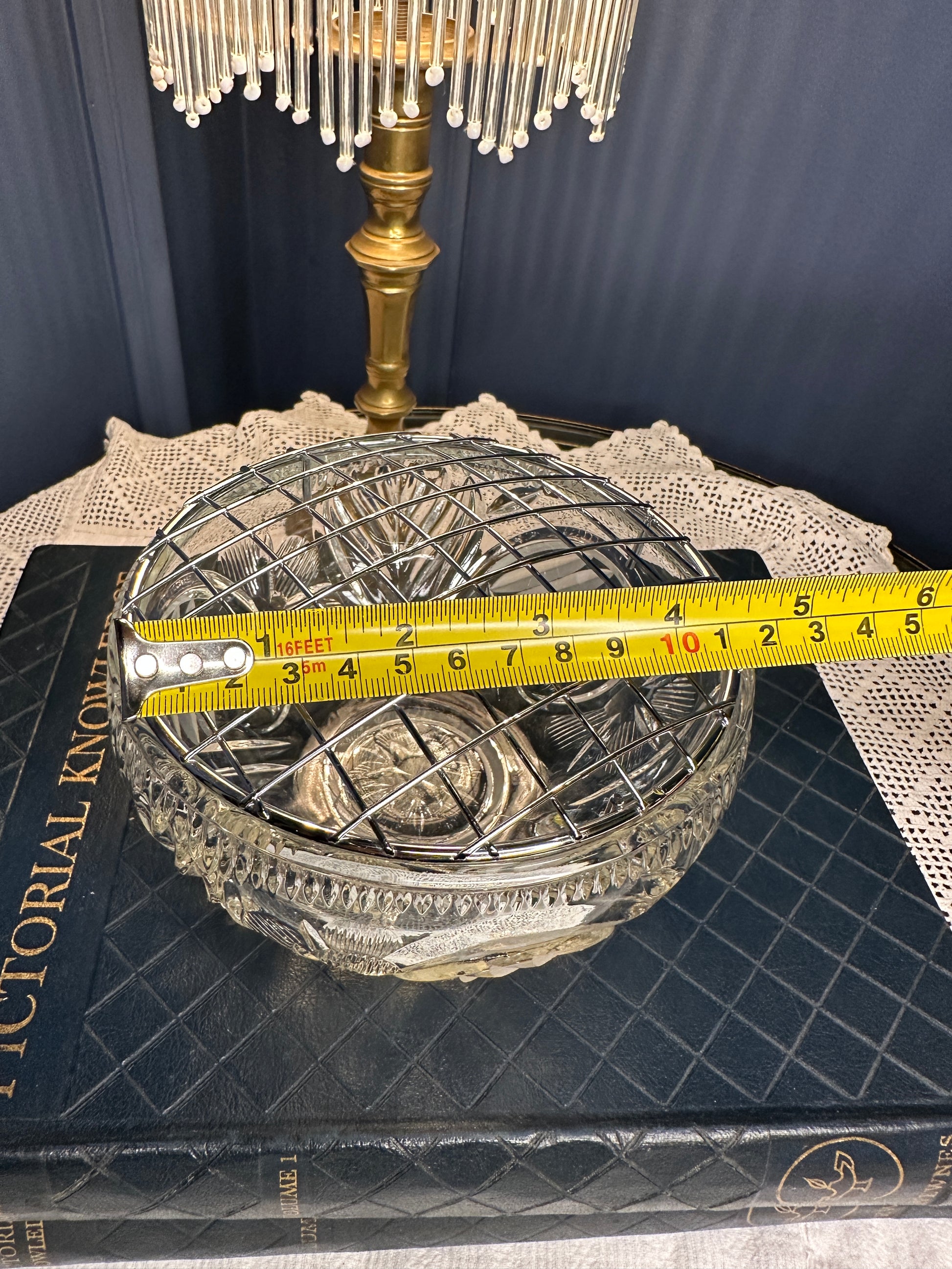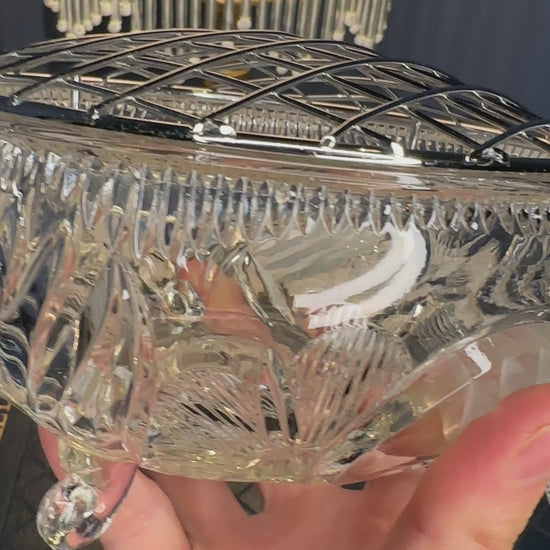 Vintage Cut Glass Rose Bowl with Metal Lattice Lid | Footed Crystal Flower Bowl