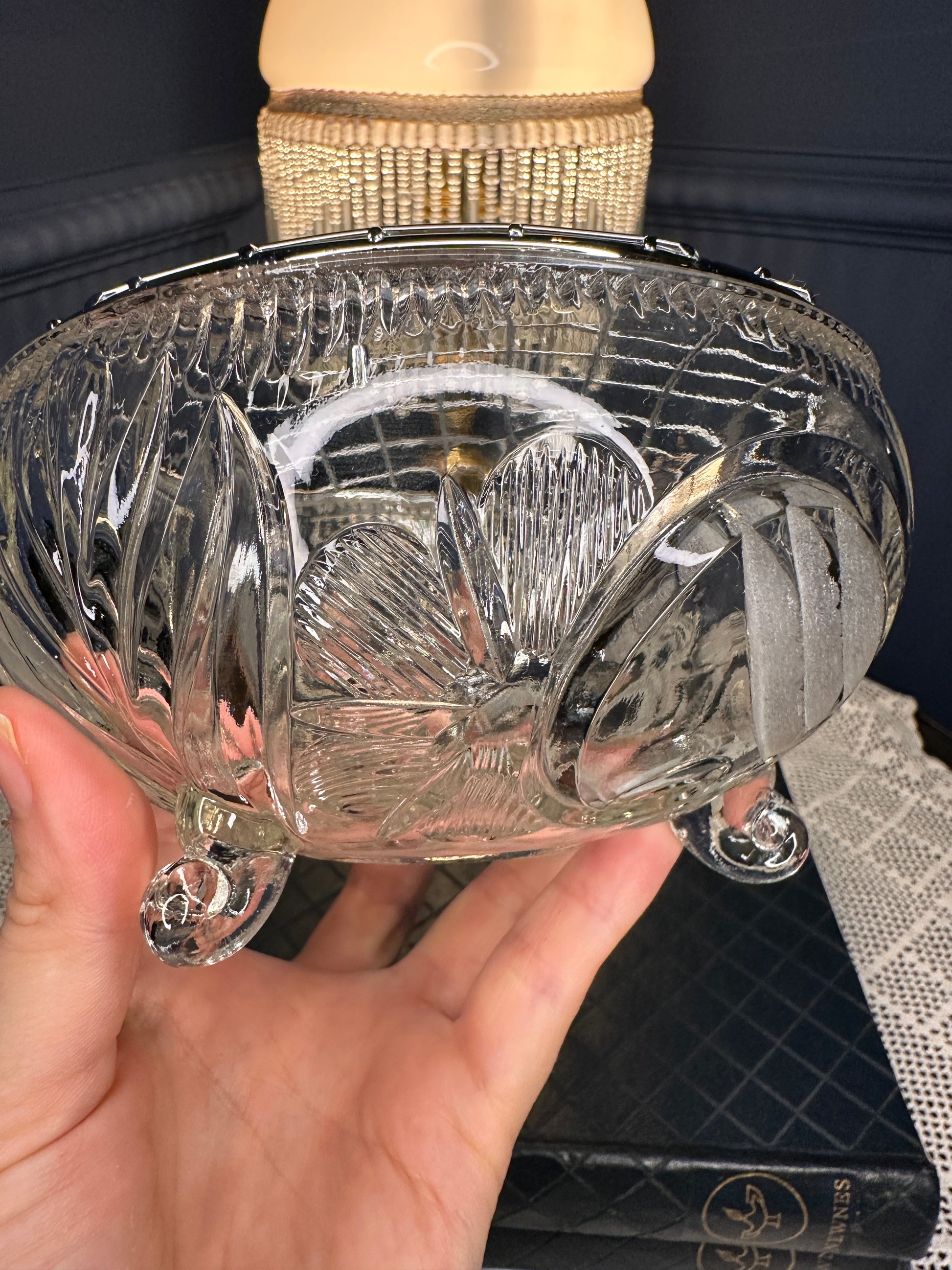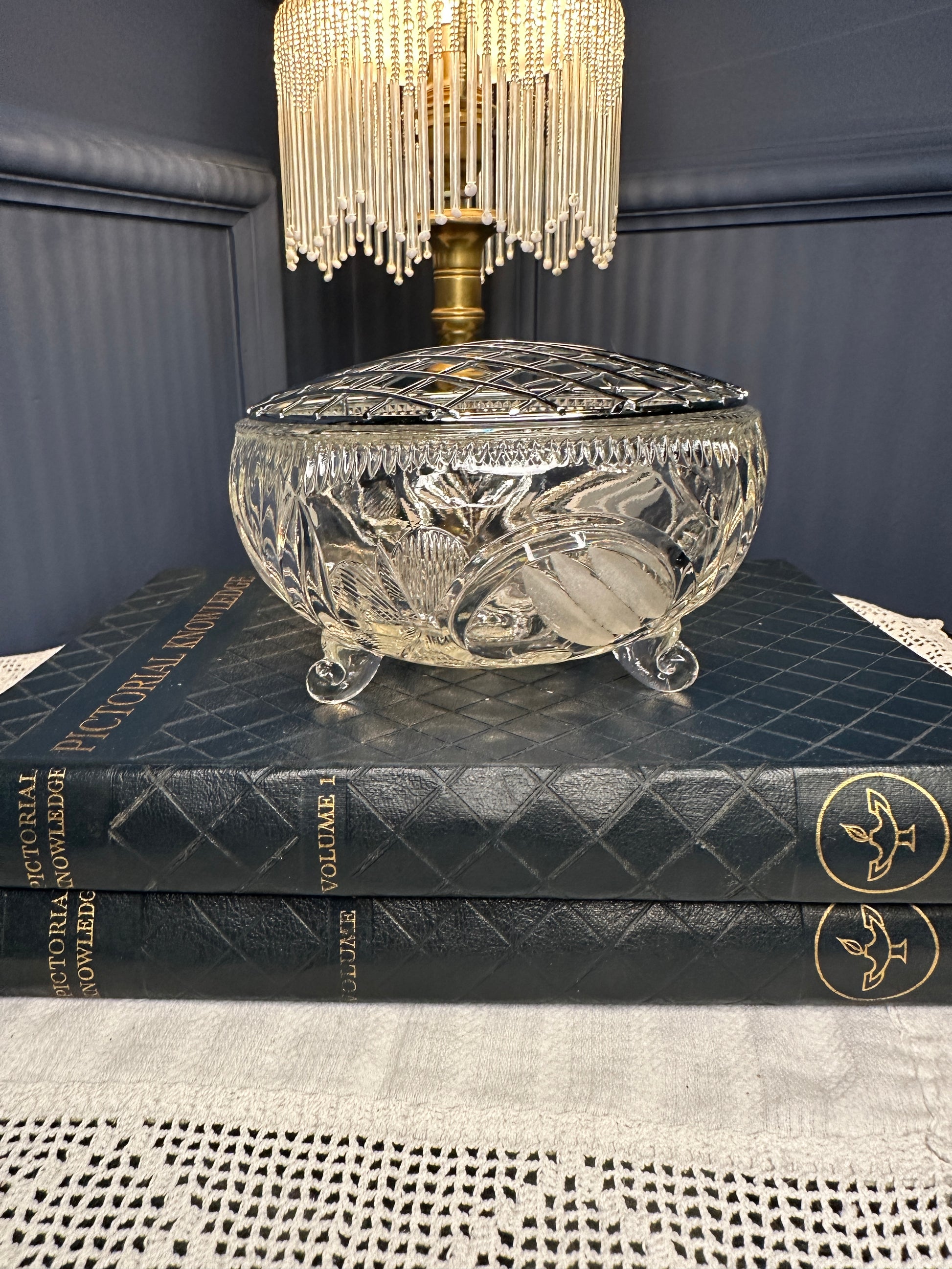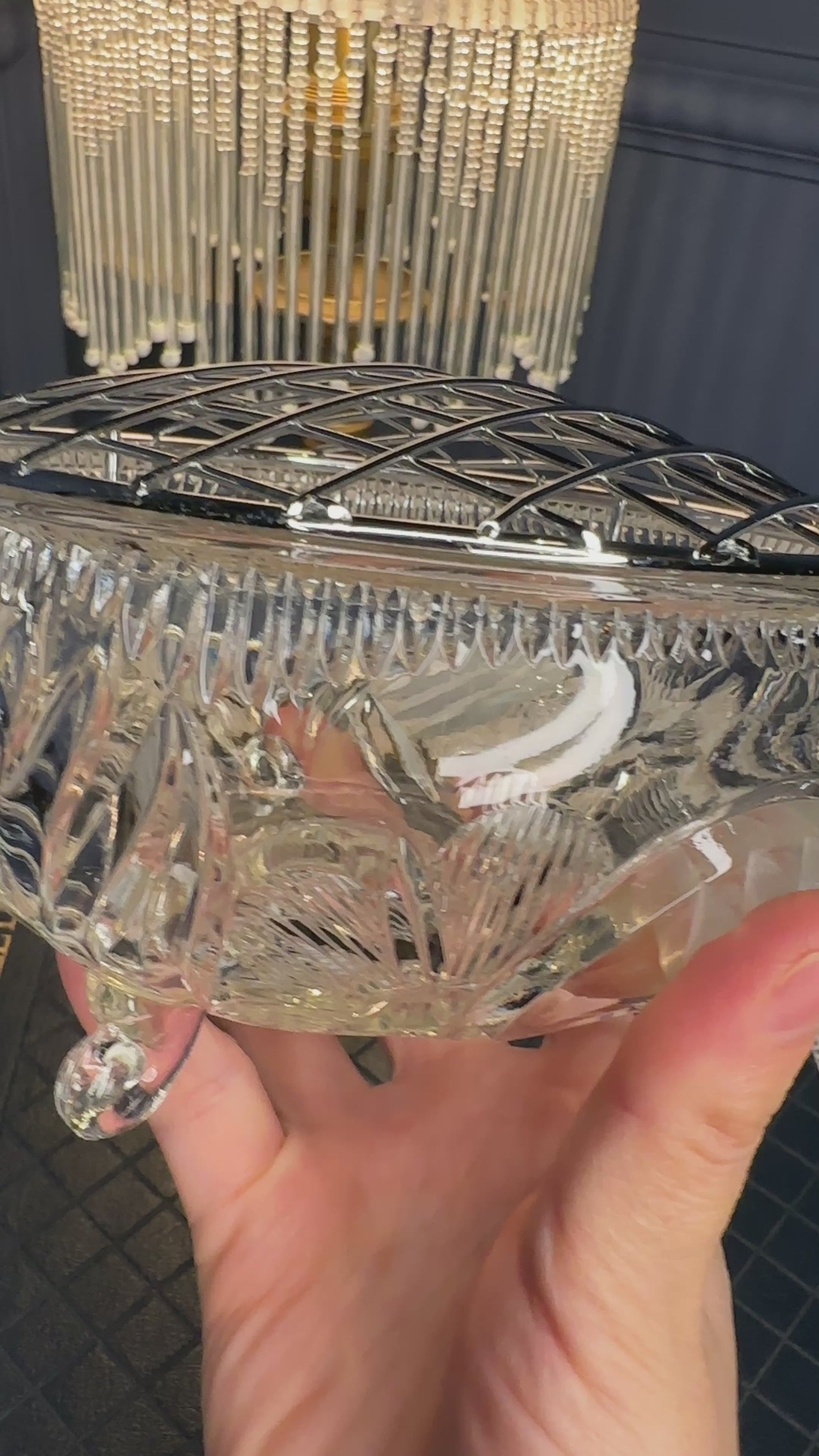 Elegant vintage cut glass trinket box featuring a beautifully detailed floral and geometric pattern. This footed crystal bowl is topped with a domed silver-tone metal lattice lid, combining classic glass craftsmanship with timeless style. Ideal for storing jewelry, rings, or small keepsakes, and perfect as vanity, dresser, or coffee table décor.