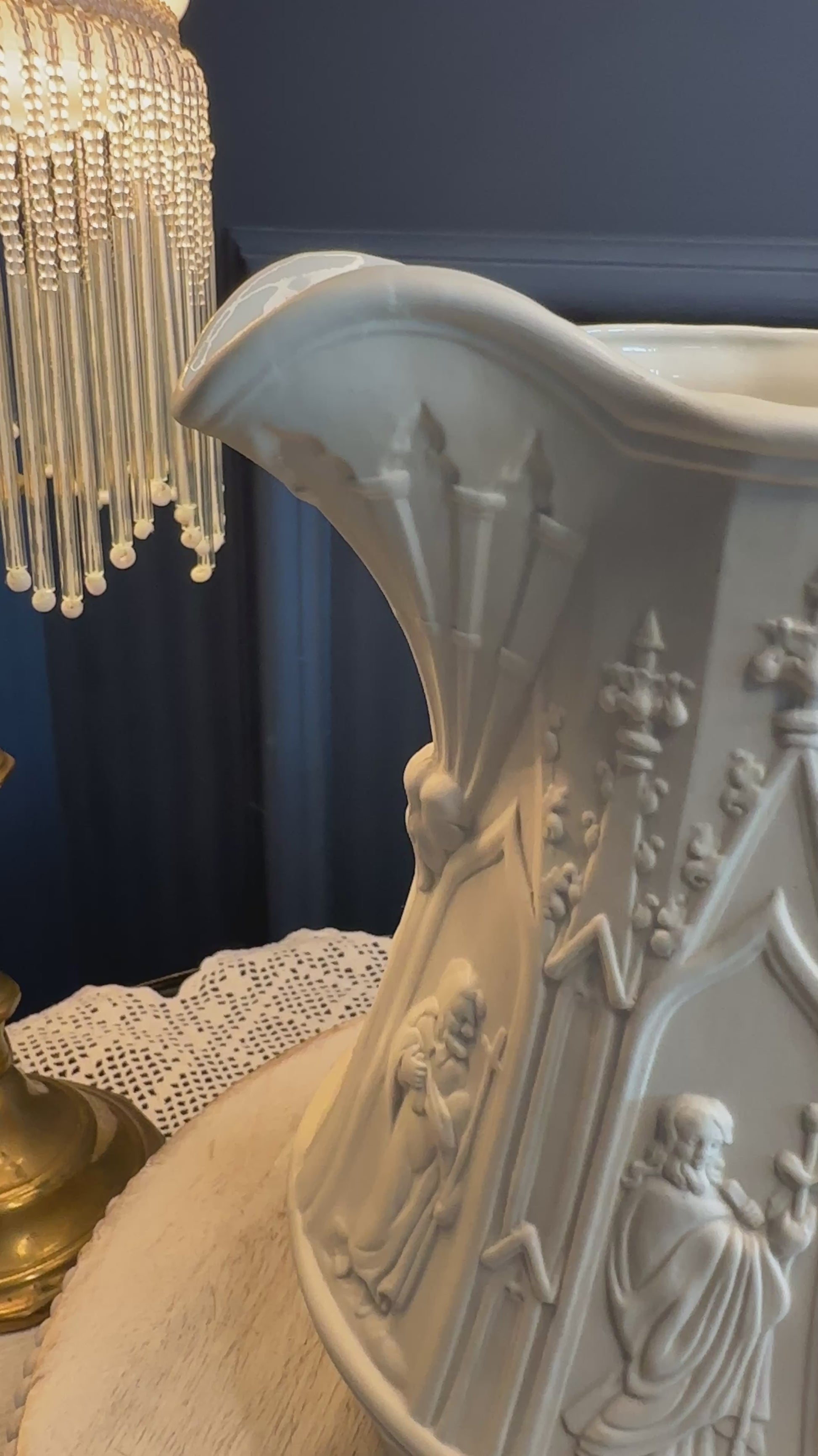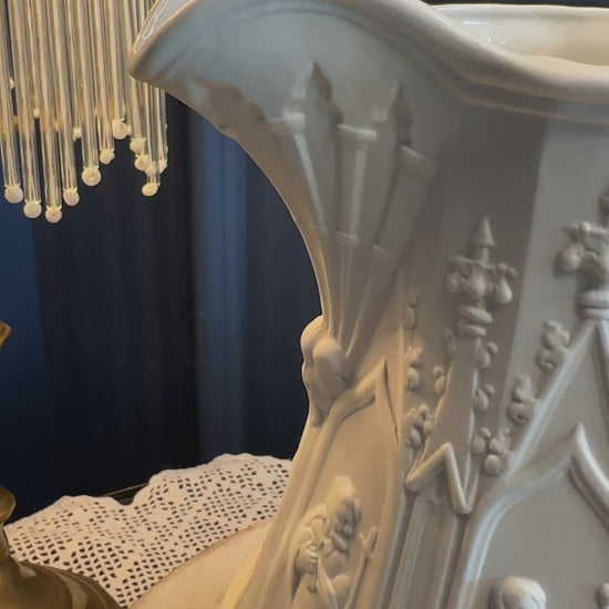 A striking vintage Portmeirion Totem jug, crafted in England and decorated with dramatic Gothic architectural relief panels featuring robed figures and cathedral spires. Made from heavy white stoneware, this sculptural piece is both timeless and highly decorative.